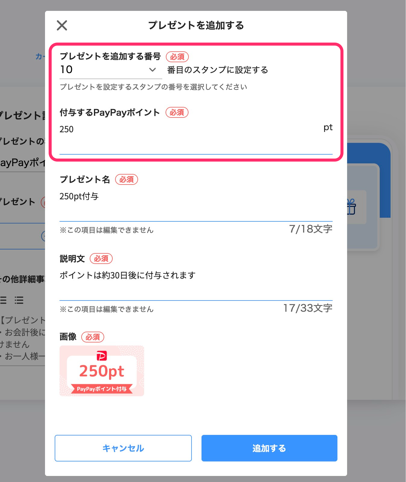 付与するポイント数は、プレゼント獲得までに必要な累計決済金額の20%以内に収めてください。20%を超えると、「設定可能な金額を超えています」というエラーメッセージが表示されます。