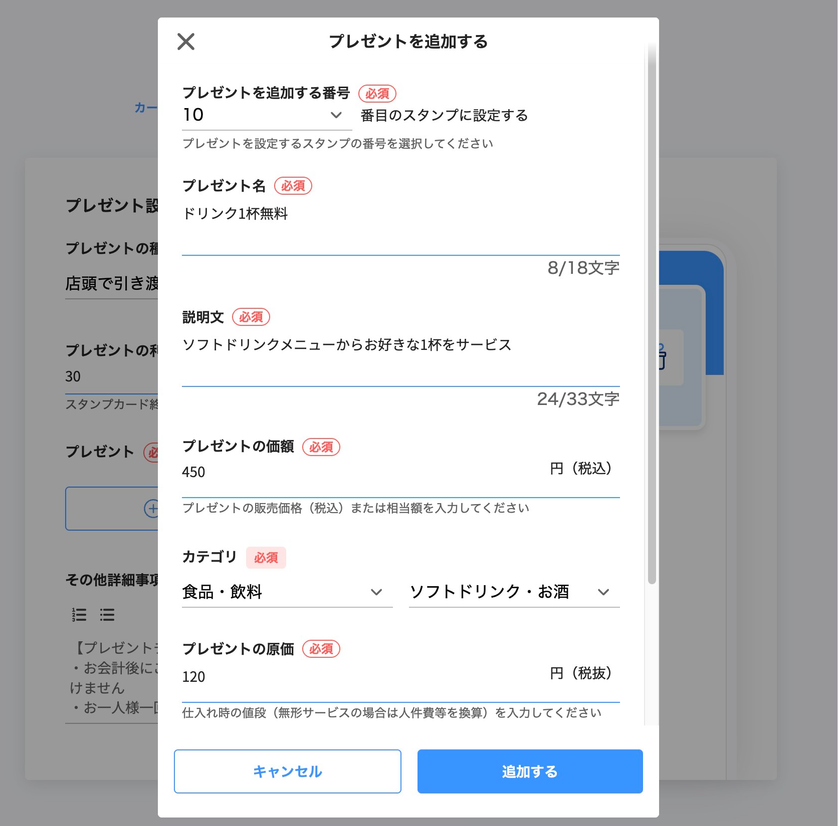 設定したプレゼントの原価と同額の費用が、スタンプカード利用料として発生します。詳しくはPayPayマイストア ライトプランの利用料金を参照してください。