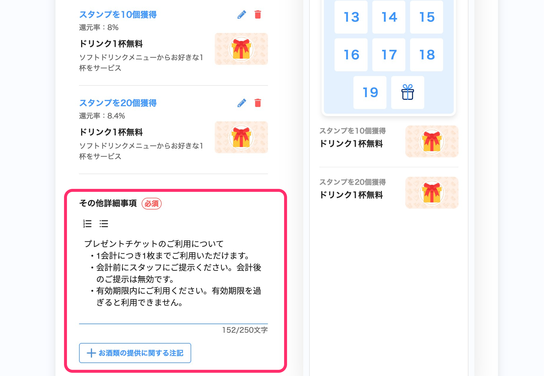 例えば「10」を選択すると、「スタンプを10個貯めるとプレゼントが付与される」という設定となります。
