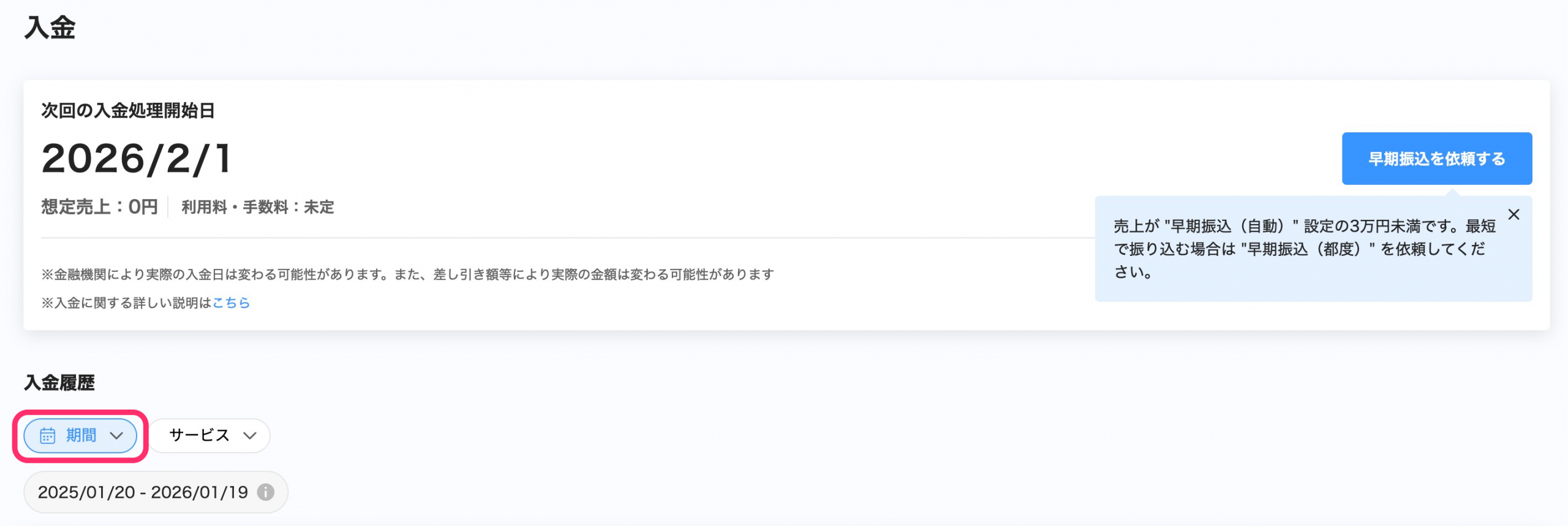 入金履歴の期間指定をすることで、表示する期間を変更できます。