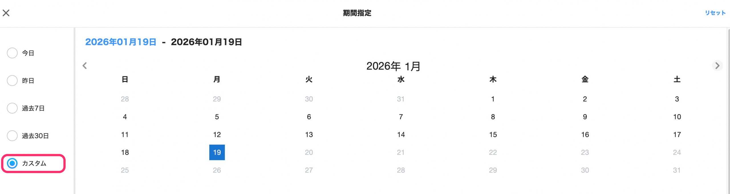 すでに期間指定がされている場合は、設定している期間が表示されています。