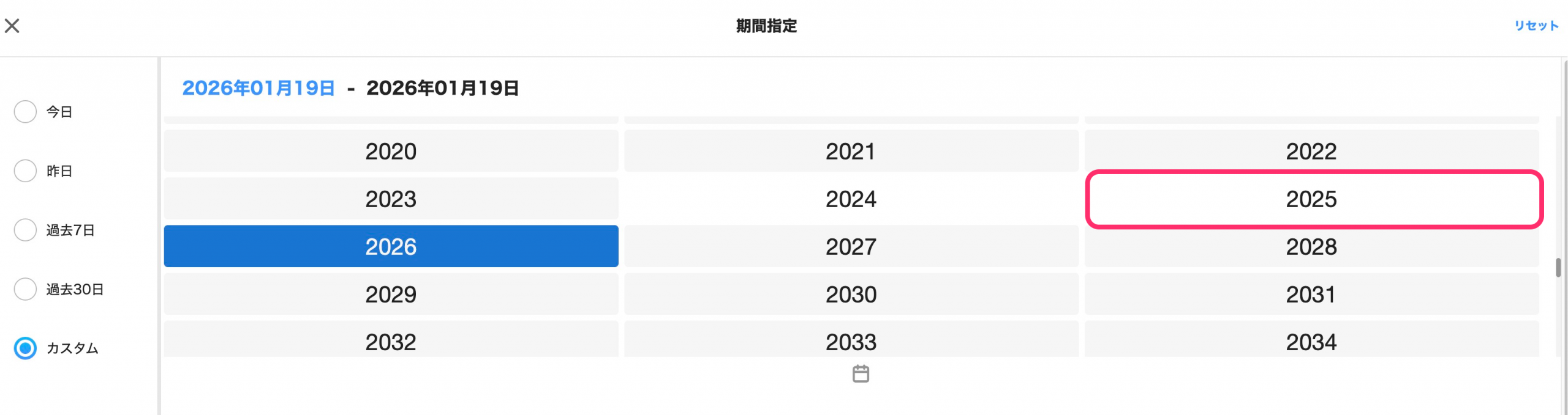 上部の開始日が青色で表示されていることを確認して、下段の年のエリアを押すと、年の選択画面が表示されます。