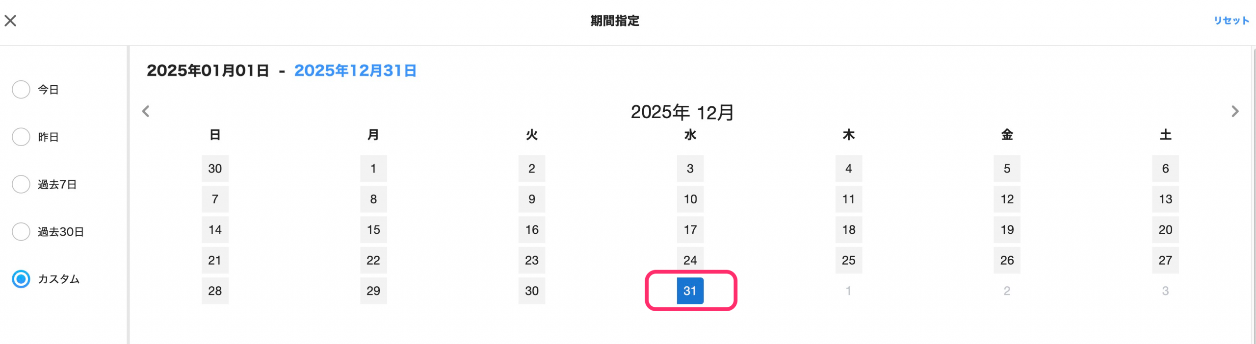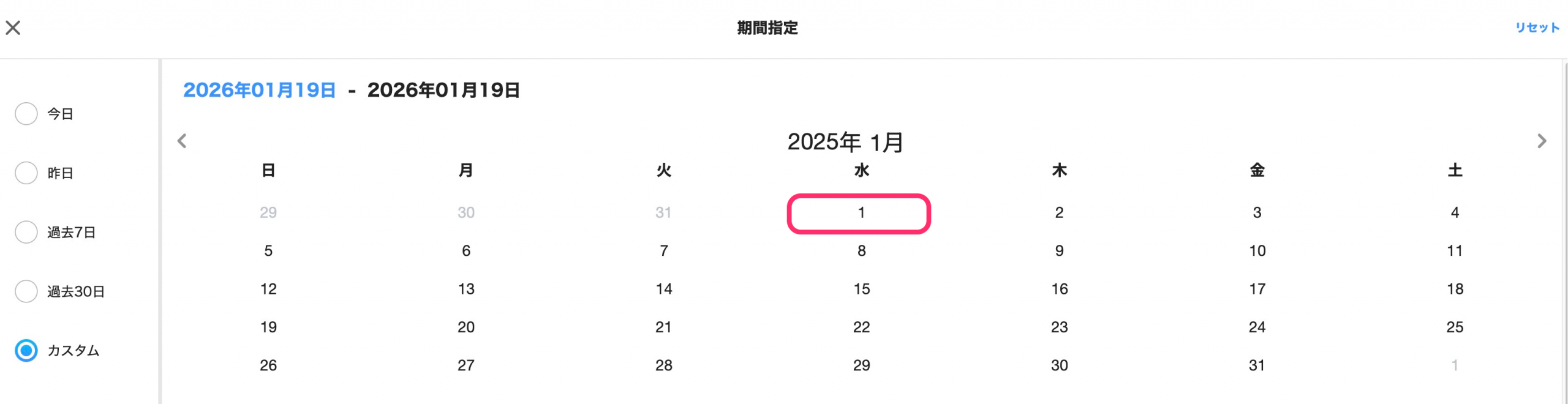 選択年を変更すると、1月のカレンダーが表示されます。開始日が「1月1日」であれば、表示されているカレンダーから選択します。