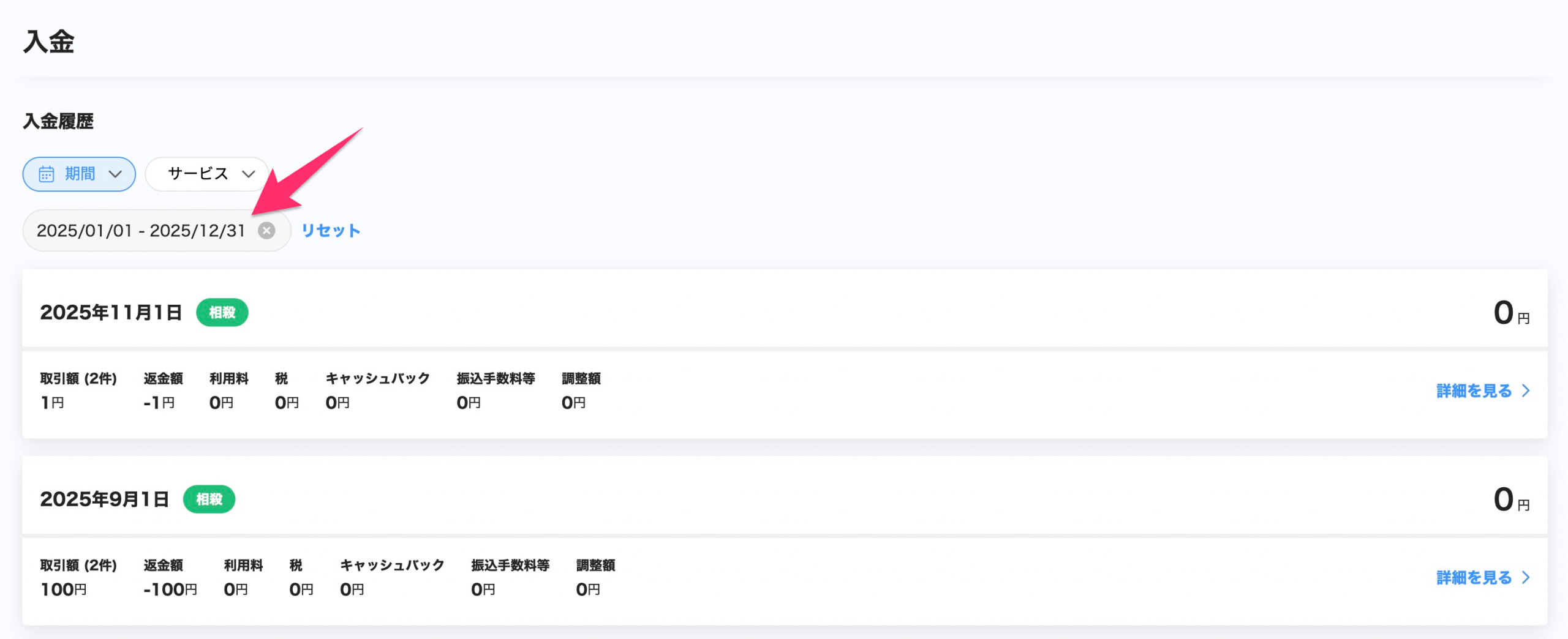 開始日と終了日の選択が完了すると、入金一覧画面に戻ります。選択した期間の履歴が一覧に表示されていることを確認します。