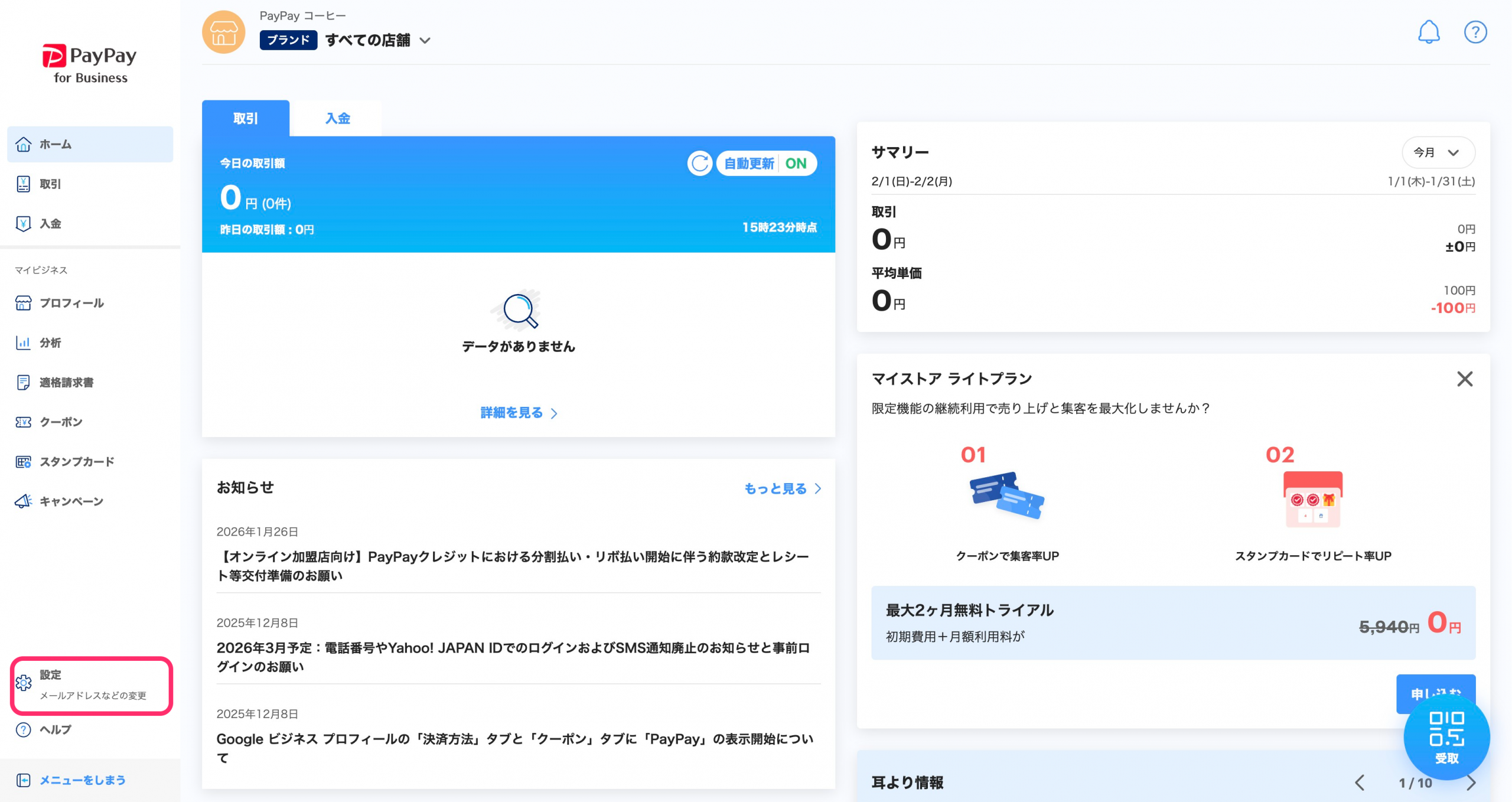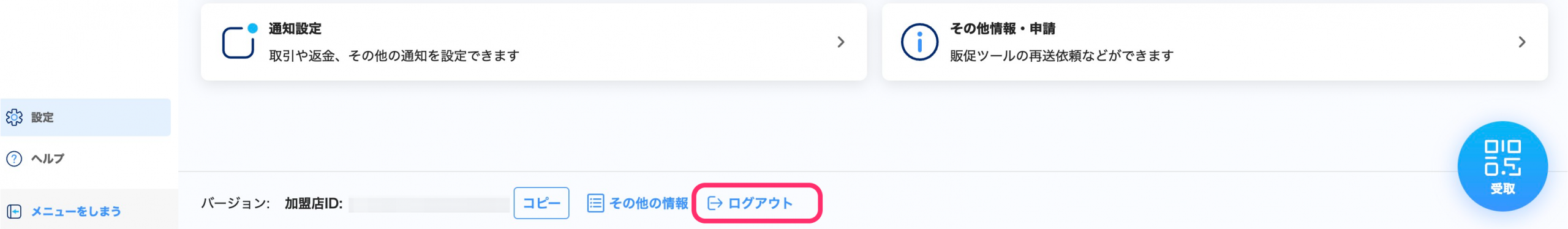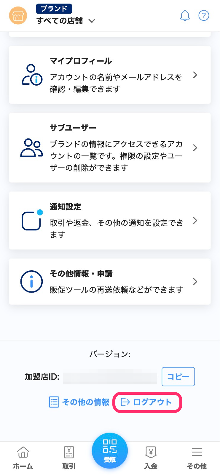 設定一覧画面の最下部にある[ログアウト]を押すと、PayPay for Businessからログアウトし、ログイン画面が表示されます。