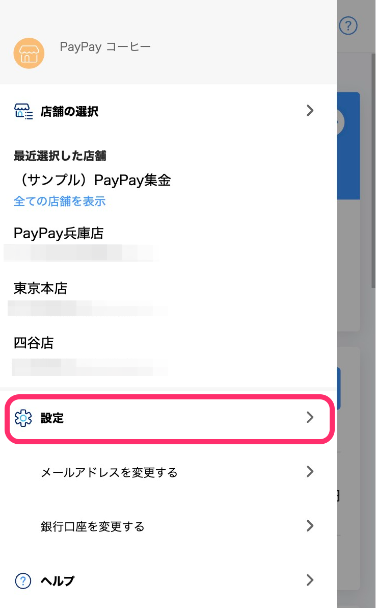 アプリまたはスマートフォンから操作する場合、左上の店舗名または[すべての店舗]を押してメニューを展開すると、[設定]が表示されます。