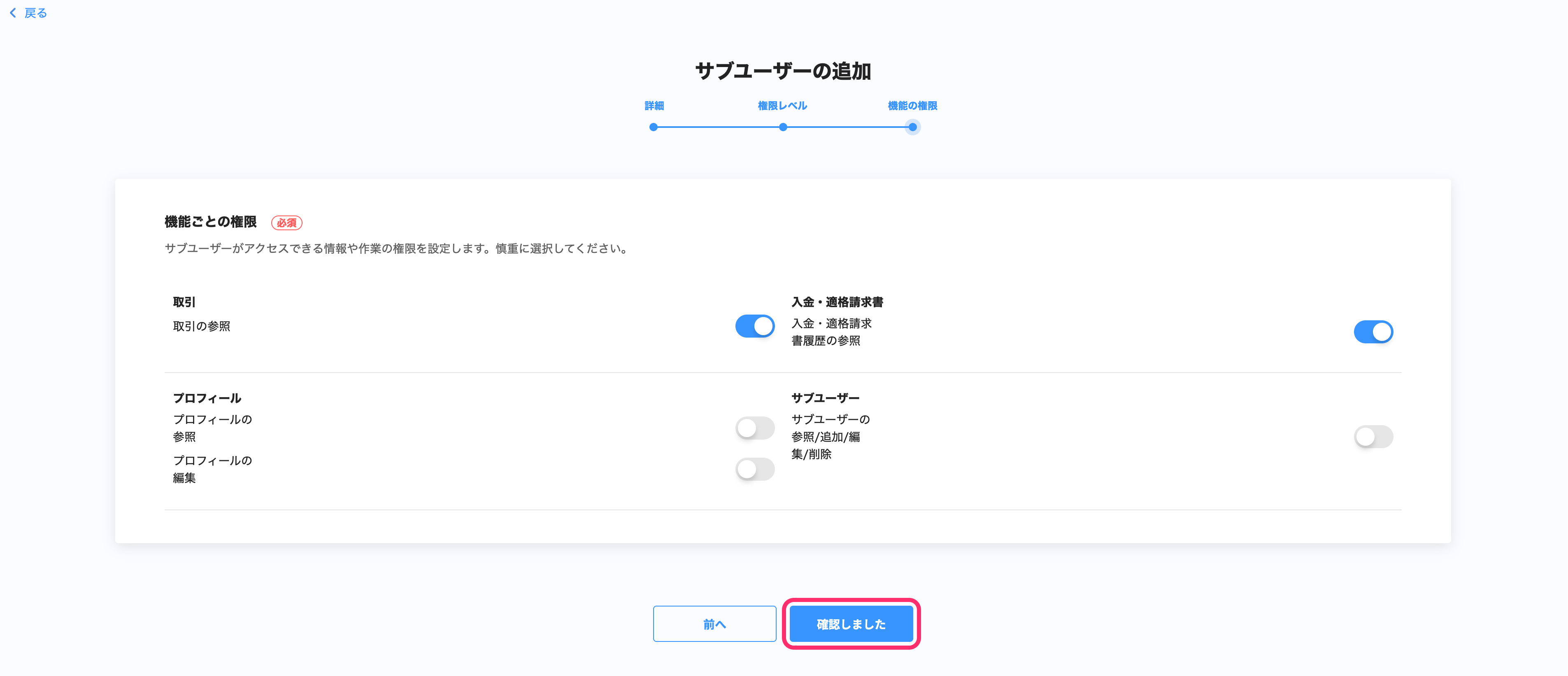 追加するサブユーザーが閲覧・操作できる機能を選択します。