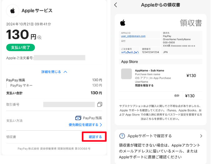 PayPayで「Appleご注文番号」を控えていただき、Apple公式サイトの購入履歴にて該当のご注文番号をご確認ください。