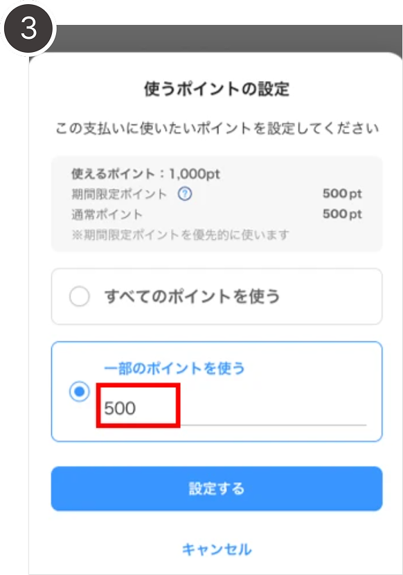 • 3.使いたいポイント数を指定し[設定する]をタップ