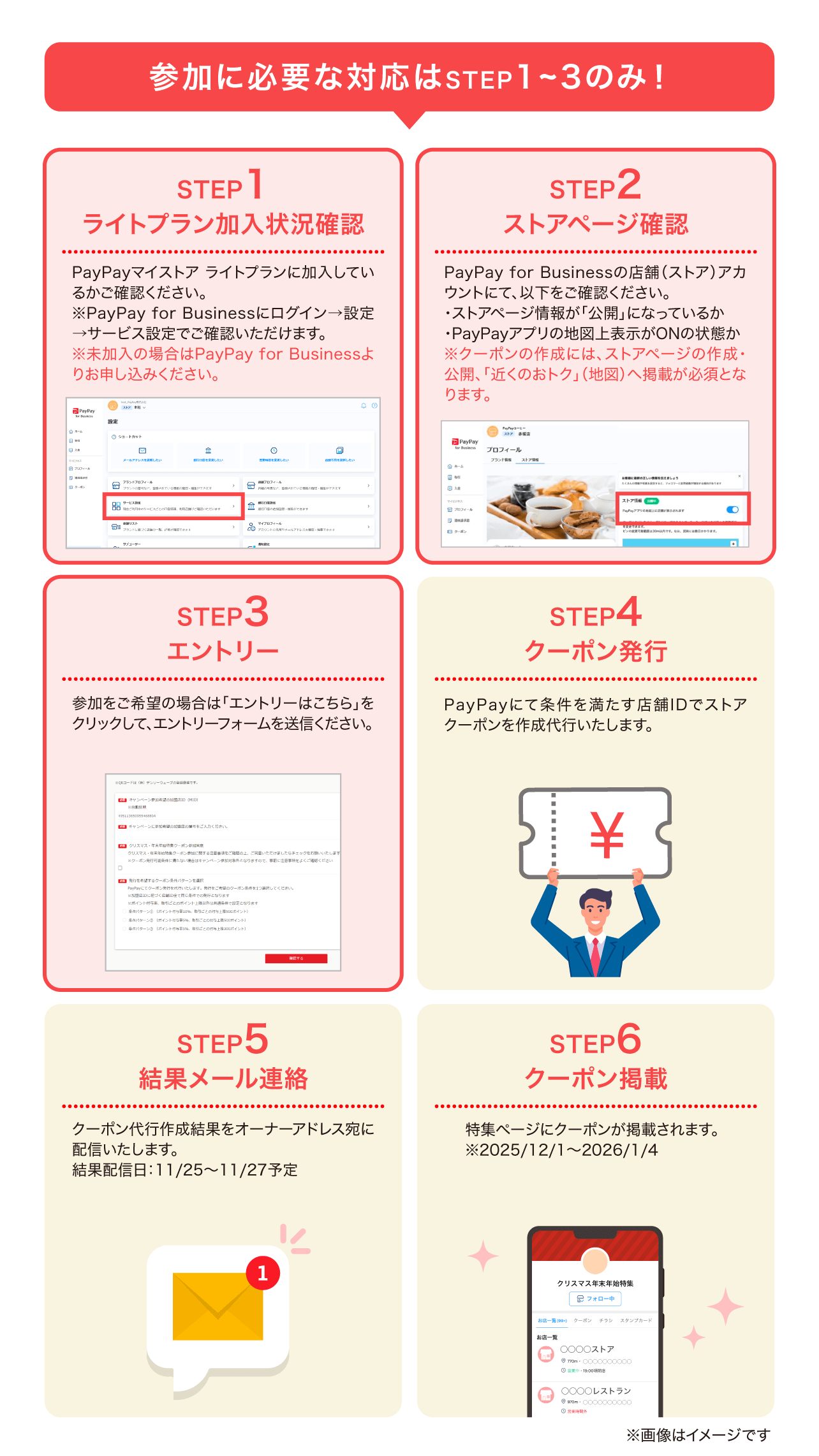 PayPay株式会社(以下「当社」とします。)が提供するスマホ決済をご利用いただいている加盟店様が、本キャンペーンへエントリーいただいた場合、当社にて「クリスマス&年末年始特集」専用PayPayクーポンを店舗ID単位で作成代行いたします。