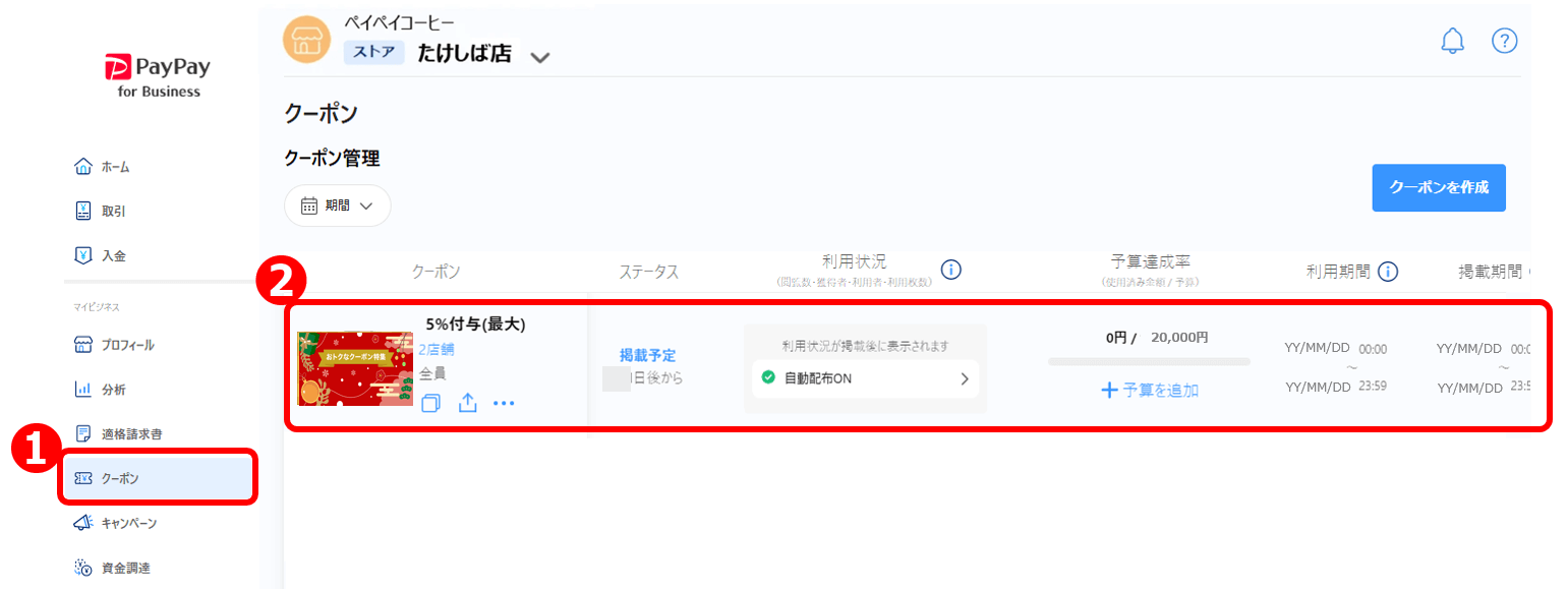 発行されたクーポンにつきましてはPayPay for Businessよりご確認いただけます。