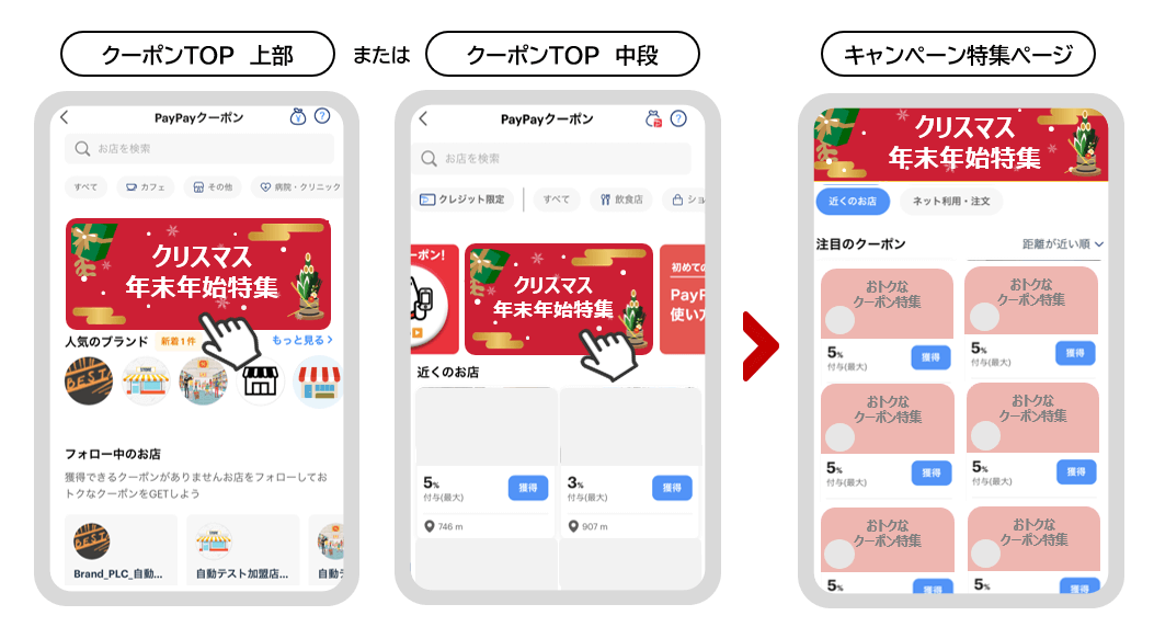 作成代行したクーポンは、PayPayアプリ内のキャンペーン特集コーナーへ掲載いたします。また、クーポン利用期間中に特集コーナーへ遷移する専用バナーをクーポンコーナーTOPに設置いたします。