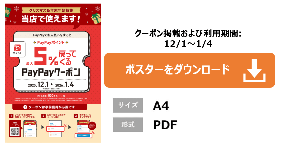 クーポンが作成できた加盟店様にはキャンペーン専用ポスターのダウンロードリンクをお送りしますので、店頭でもクーポンの実施をアピールできます!