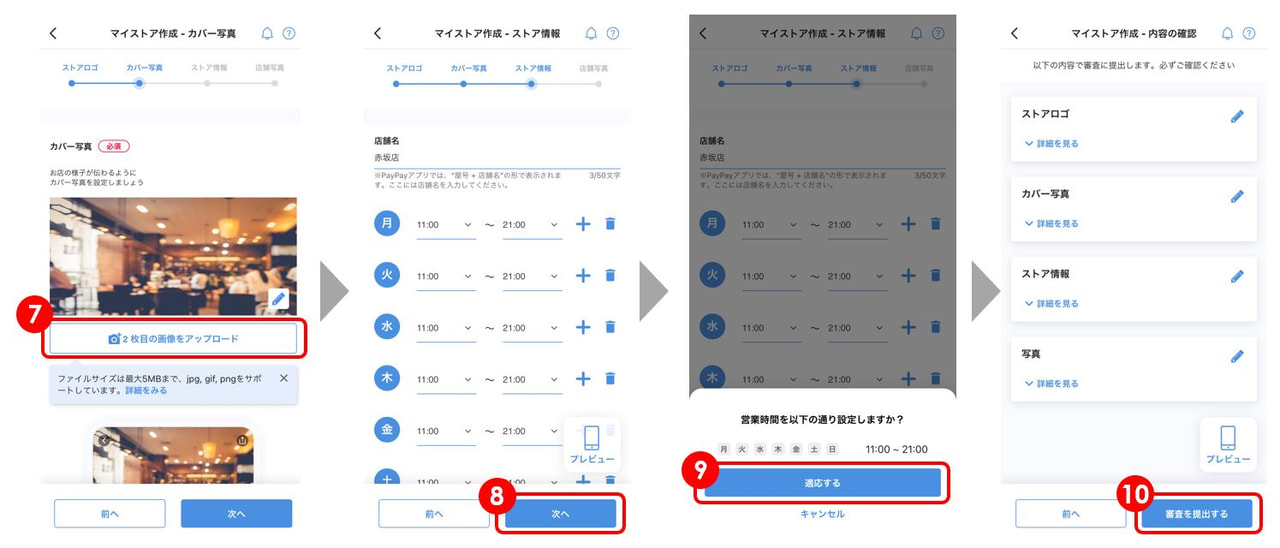 (8)「ストア情報」では店舗名と営業時間を入力し「次へ」をクリック
