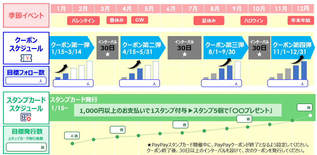 PayPayクーポンで新規のお客様を獲得、PayPayスタンプカードでリピーターになってもらうために下記のようなスケジュールがおすすめです!