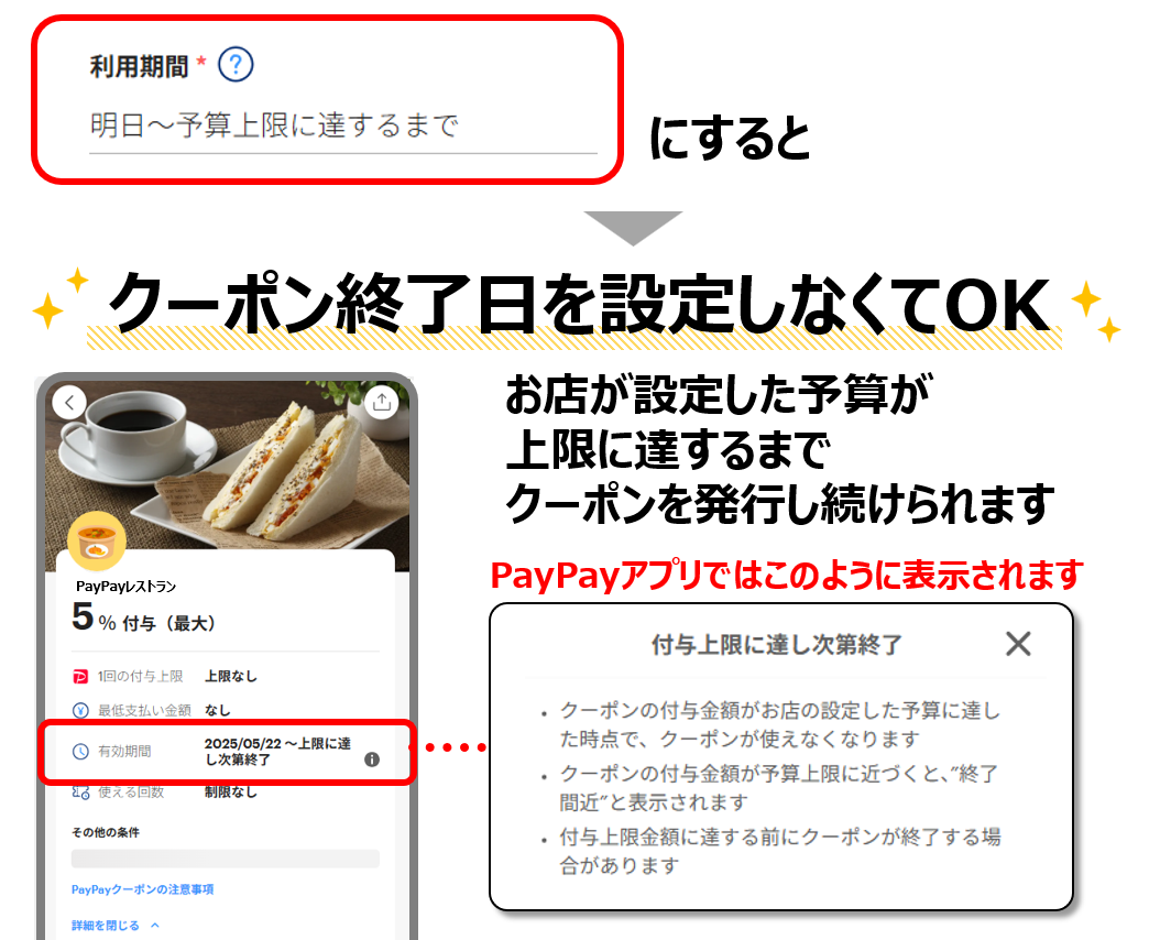 「長い期間、クーポンを露出したいけど予算が心配」などPayPayクーポンの利用期間に悩んだら、利用期間を「予算上限に達するまでにしましょう
