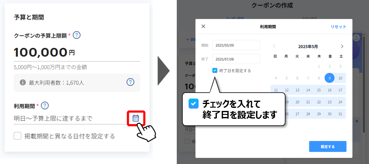 クーポン終了日を設定したい場合は「利用期間」のカレンダーをクリックして終了日を設定してください。