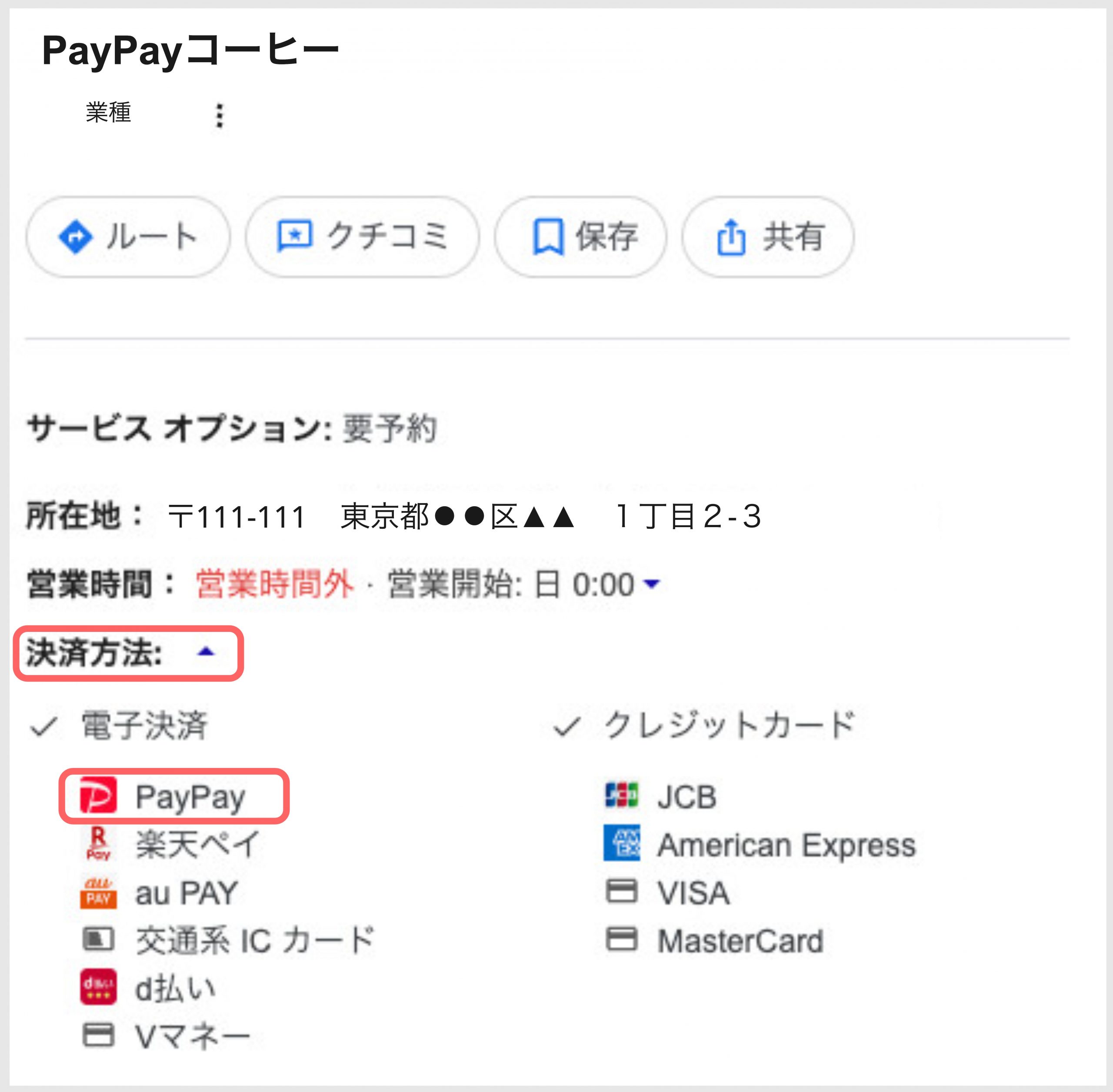 ・Google ビジネス プロフィールの決済方法で、「PayPayで支払い可」を「いいえ」にしていると、表示されません。