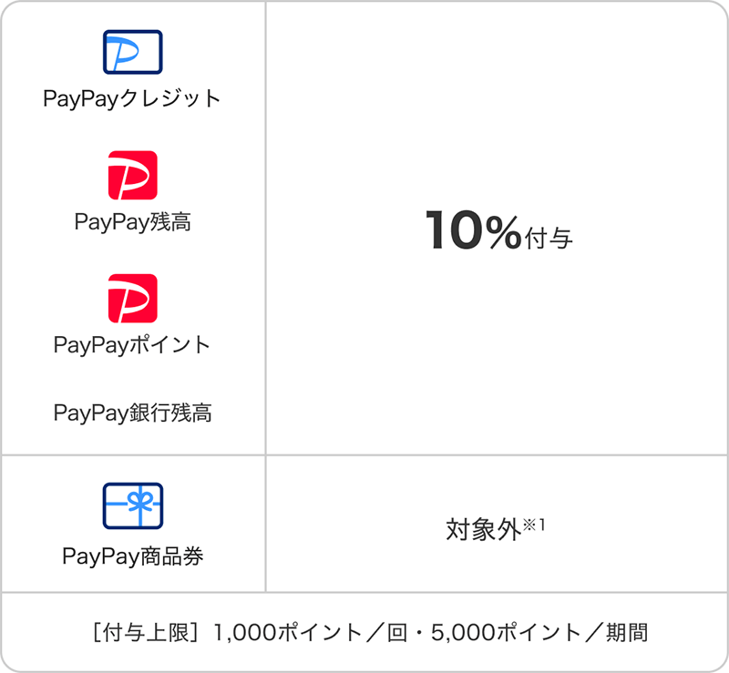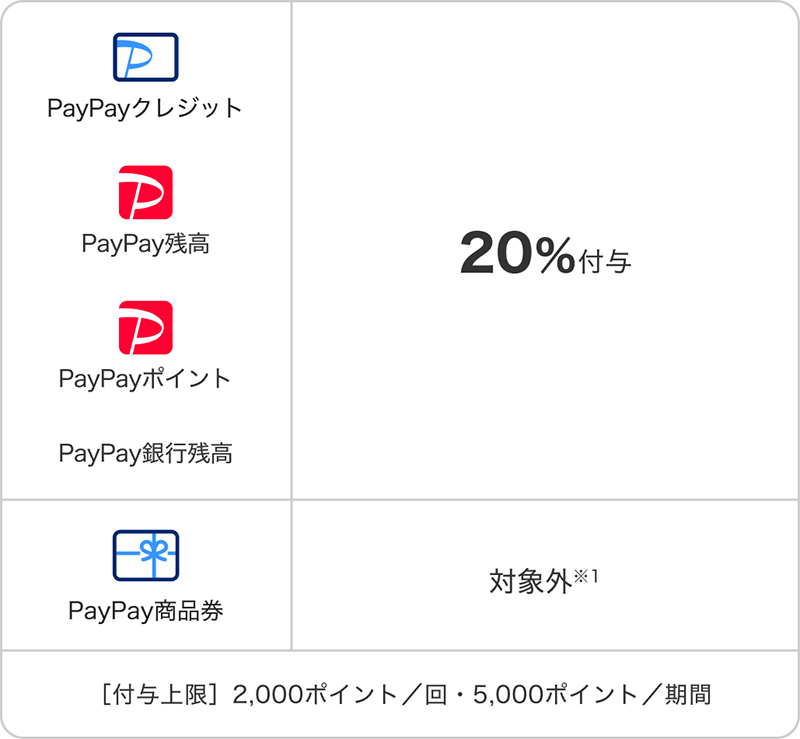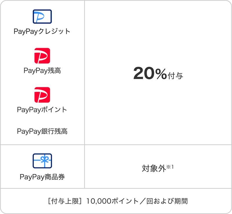 ※1 PayPay商品券とPayPay残高、PayPayクレジットを併用した場合は、PayPay残高とPayPayクレジットでのお支払い分のみ、本キャンペーンによるポイント付与の対象となります。