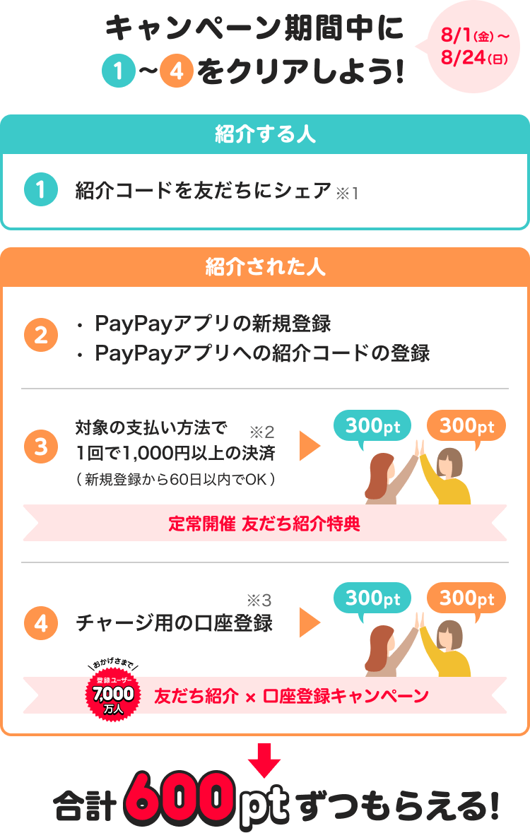 本キャンペーン期間中に、家族や友人から「PayPay」を紹介された人が「友だち紹介特典」キャンペーンの条件達成(※1)に加え、チャージ用口座登録(※2)をすると紹介した人(※3)および紹介された人は、それぞれ最大600ポイント(※4)もらえます。