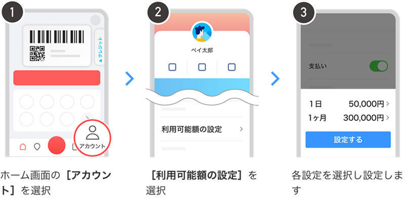 思わぬ詐欺被害に遭ってしまった際でも、設定した利用可能額に達した場合、支払いなどを保留することができます。ご利用方法にあわせて機能ごとに設定が可能です。ご自身の利用状況に合わせて、無理のない範囲で低めに設定することをお勧めします。