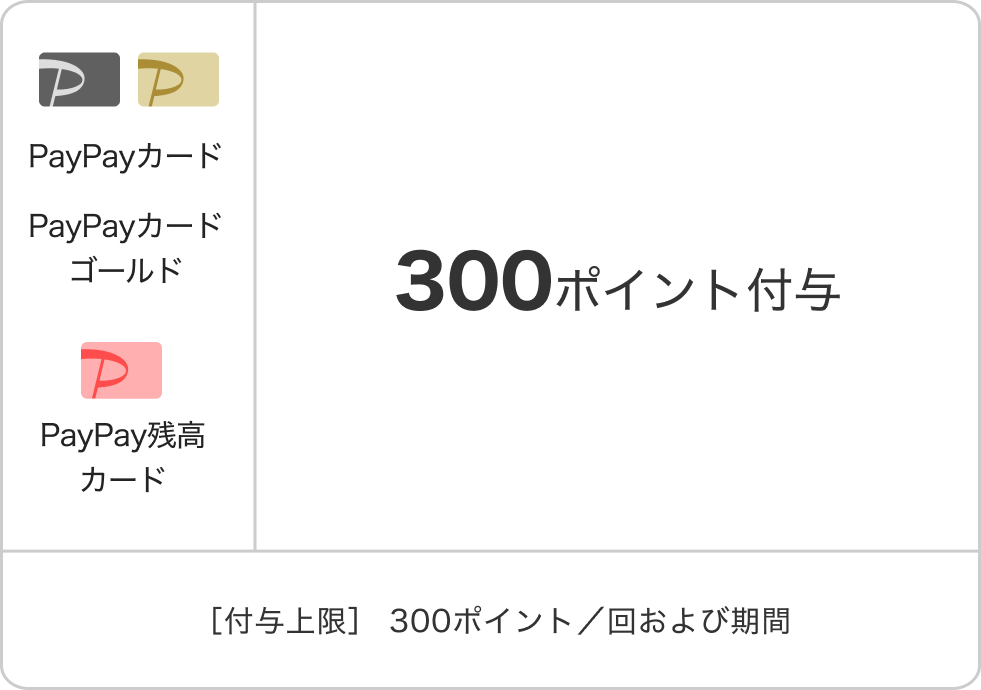 ※ ポイントをもらえるのは1人につき1回です。本キャンペーン終了後60日以内にPayPayカード社に到着した決済が対象です。一部対象外加盟店があります。詳細はキャンペーンページにてお知らせします。