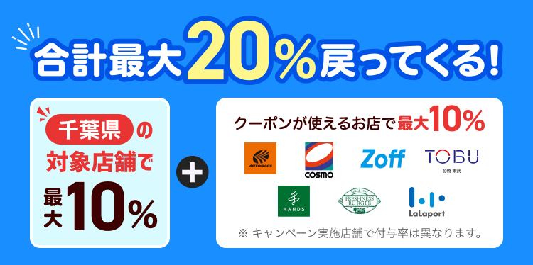 千葉県が実施するキャンペーンと「PayPayクーポン」は併用可能となり、例えば、「PayPayクーポン」で10%のポイントが戻ってくる加盟店においては、あわせて最大20%のポイントが付与されます。