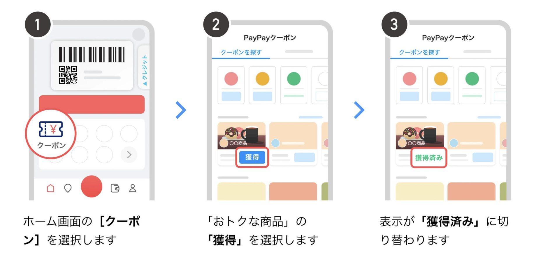 PayPayアプリのホーム画面から「クーポン」を選択し、クーポンに表示されている「獲得」ボタンをタップするだけで、簡単にクーポンが獲得できます。