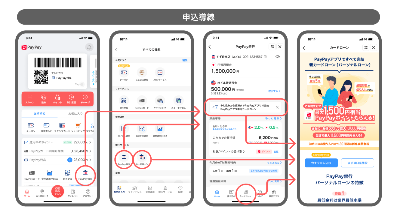 PayPayアプリの「PayPay銀行」ミニアプリまたは「カードローン」ミニアプリから申し込めます。借り入れや返済も、普段お使いのPayPayアプリだけで、いつでも簡単に利用できます。