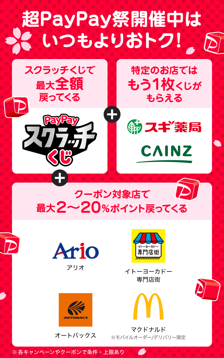 | 株式会社イトーヨーカ堂 | アリオ | 2026/3/16 | 2026/3/20~2026/3/29 | 「PayPay」で支払うと、支払金額が2,000円(税込)以上で最大5%の「PayPayポイント」を付与。(付与上限:最大1,000pt/回及び期間) |