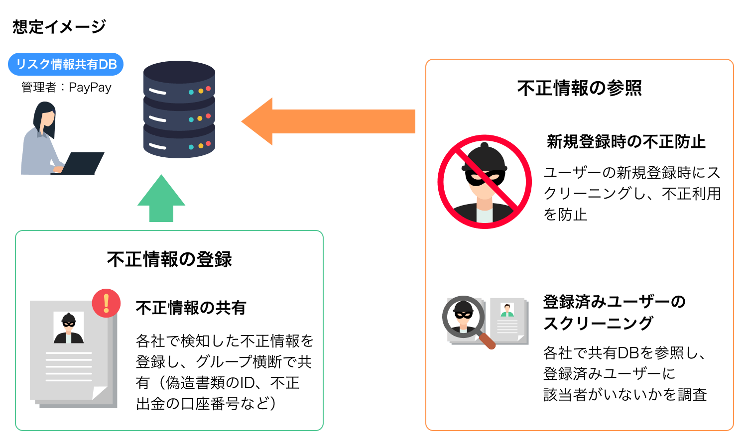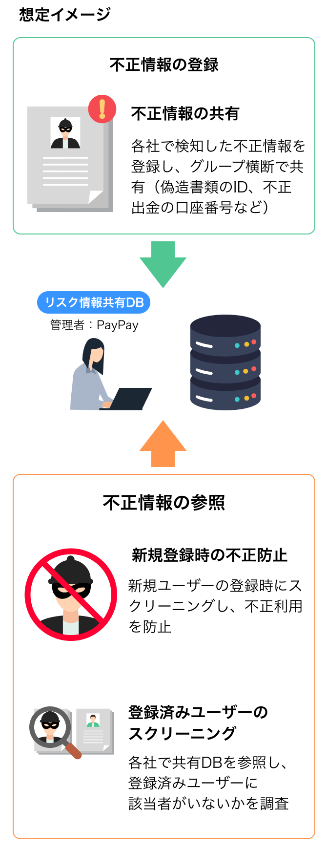PayPay金融グループ各社では、お客様が安心安全にサービスをご利用いただけるよう、各社の不正リスク情報を共有し、不正利用の検知・判断を早い段階で、確実におこなえるようにします。