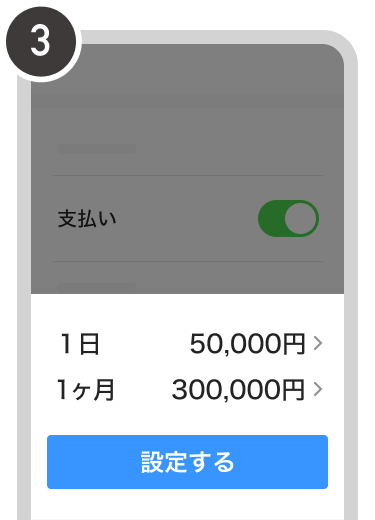 思わぬ詐欺被害に遭ってしまった際でも、設定した利用可能額に達した場合、支払いなどを保留することができます。ご利用方法にあわせて機能ごとに設定が可能です。ご自身の利用状況に合わせて、無理のない範囲で低めに設定することをお勧めします。