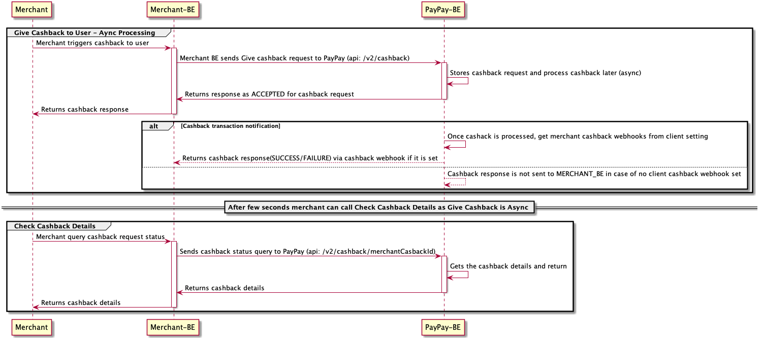 *Note : Give cashback API is async process, merchant can call Check Cashback Details API to know the status of the cashback transaction. For some error scenarios listed above will return reason for the failure as error code in the response with HTTP status 200. Check here for details.